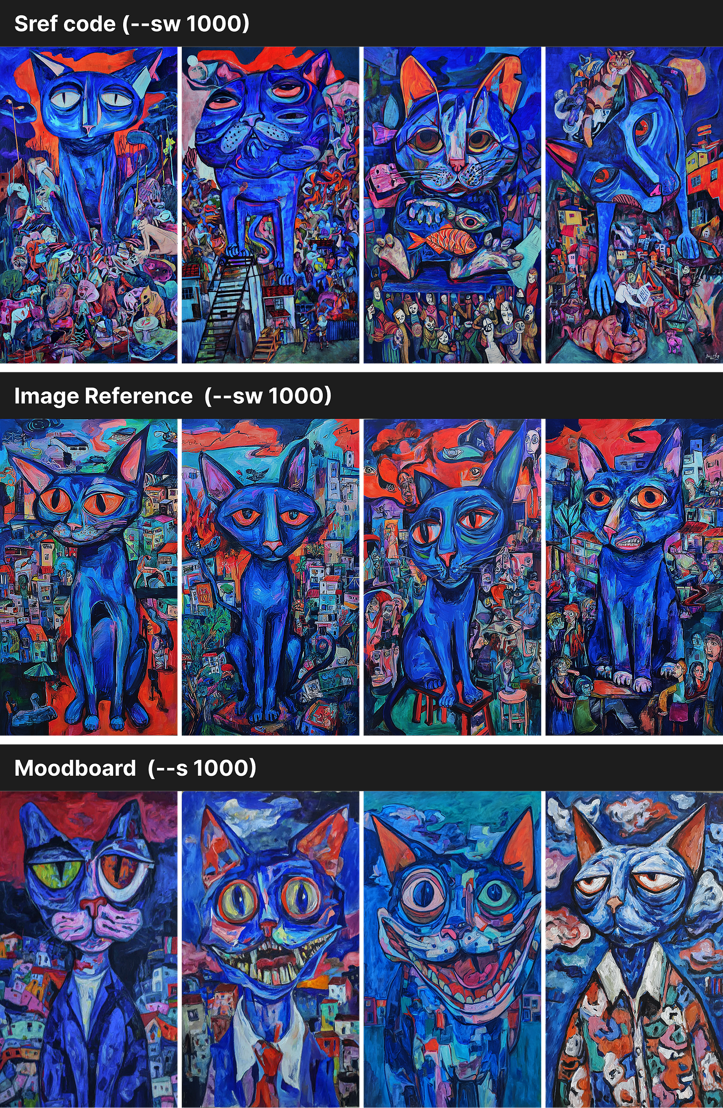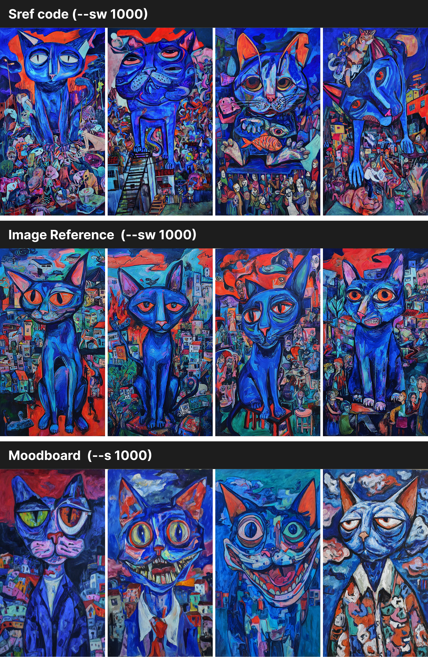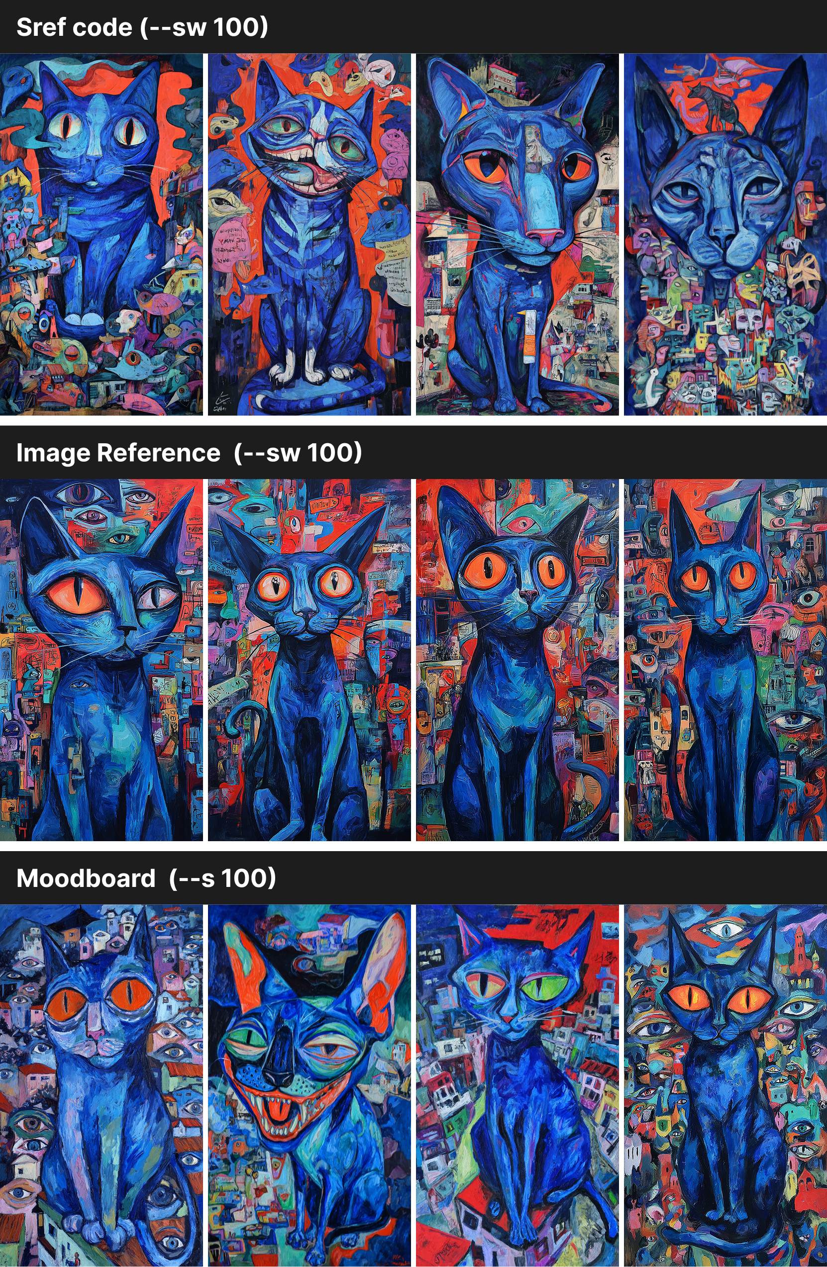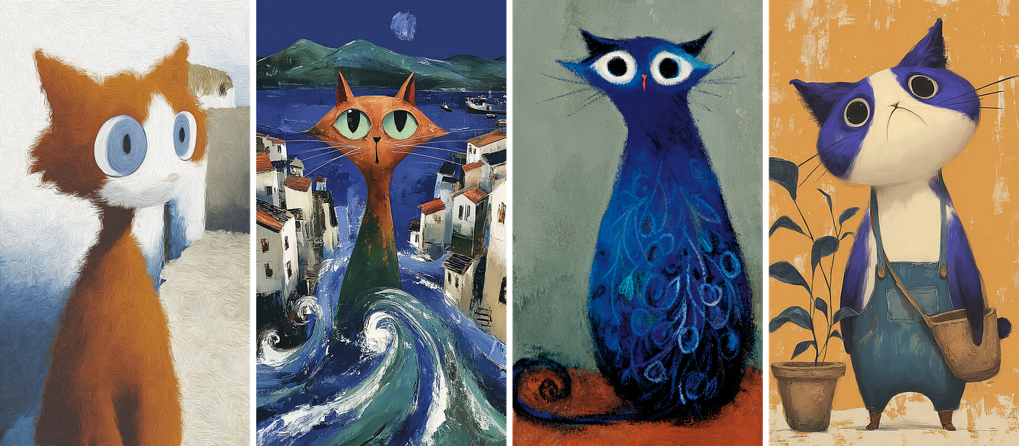 Midjourney blended all four images into one style, so the cats look almost the same across the grid. With an Sref code, the results came out richer — the cats had more variety in shape, with extra details in both the cats and the backgrounds. The colors and overall feel, though, still stayed close to the original style.