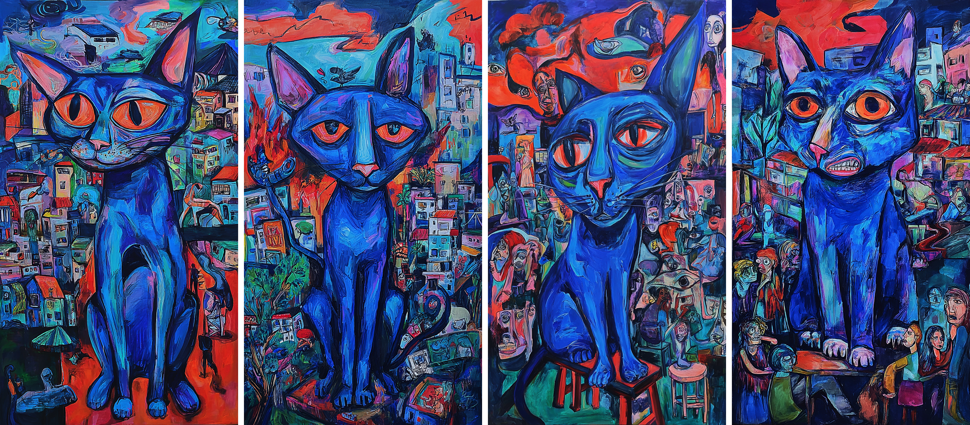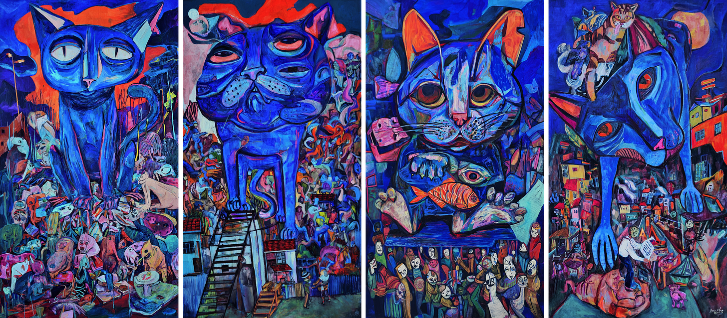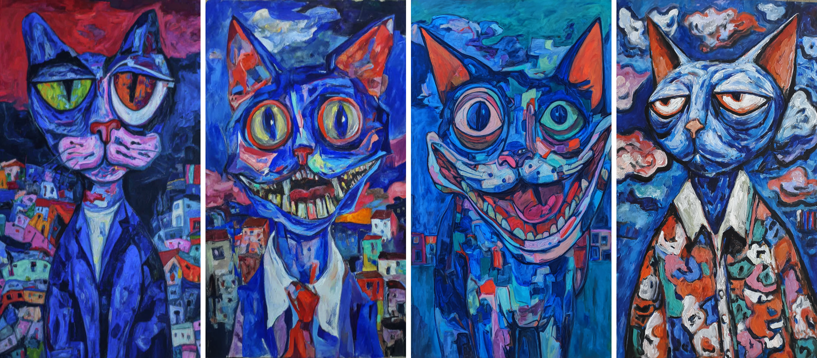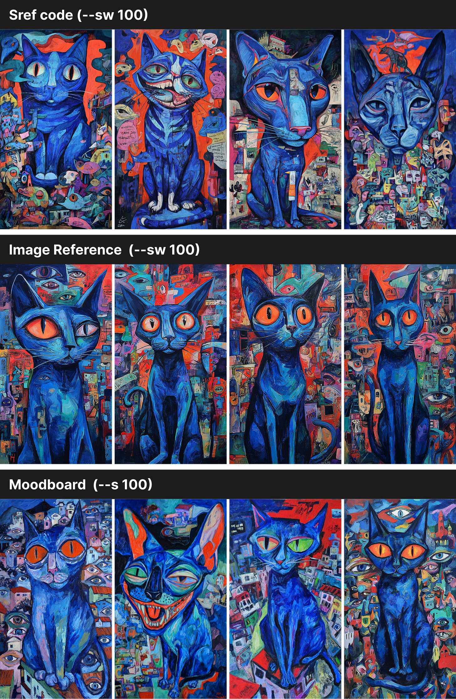 Midjourney blended all four images into one style, so the cats look almost the same across the grid. With an Sref code, the results came out richer — the cats had more variety in shape, with extra details in both the cats and the backgrounds. The colors and overall feel, though, still stayed close to the original style.