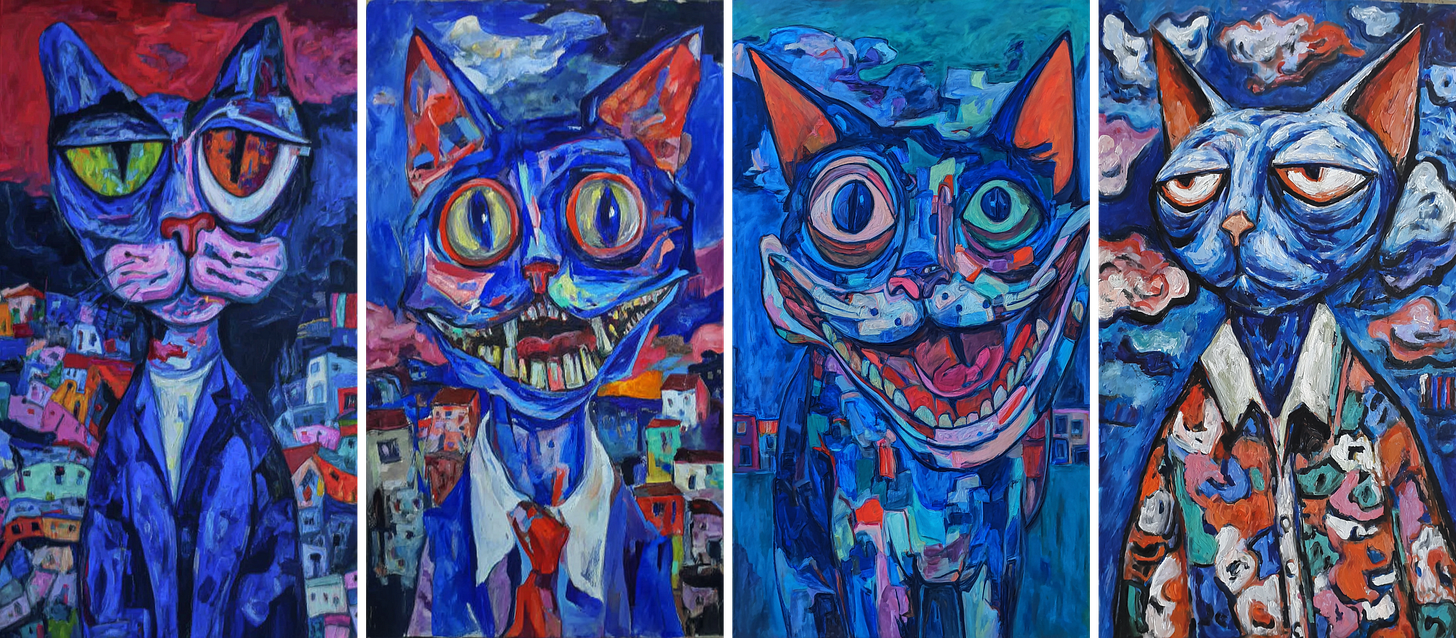We see a good variety of different cats, and the overall colors and style stay close to our source images. However, the details drift even further compared to our previous example with style reference images.