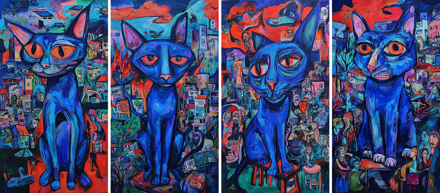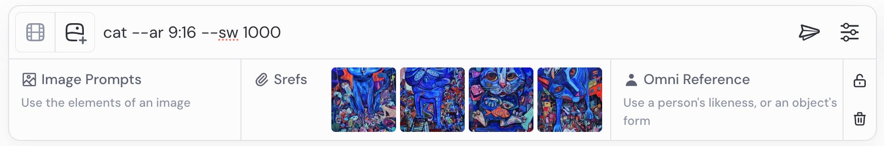 So, we’ll start our experiment with an Sref code: --sref 2926058549 and a simple prompt: cat --ar 9:16 --sref 2926058549 --sw 1000