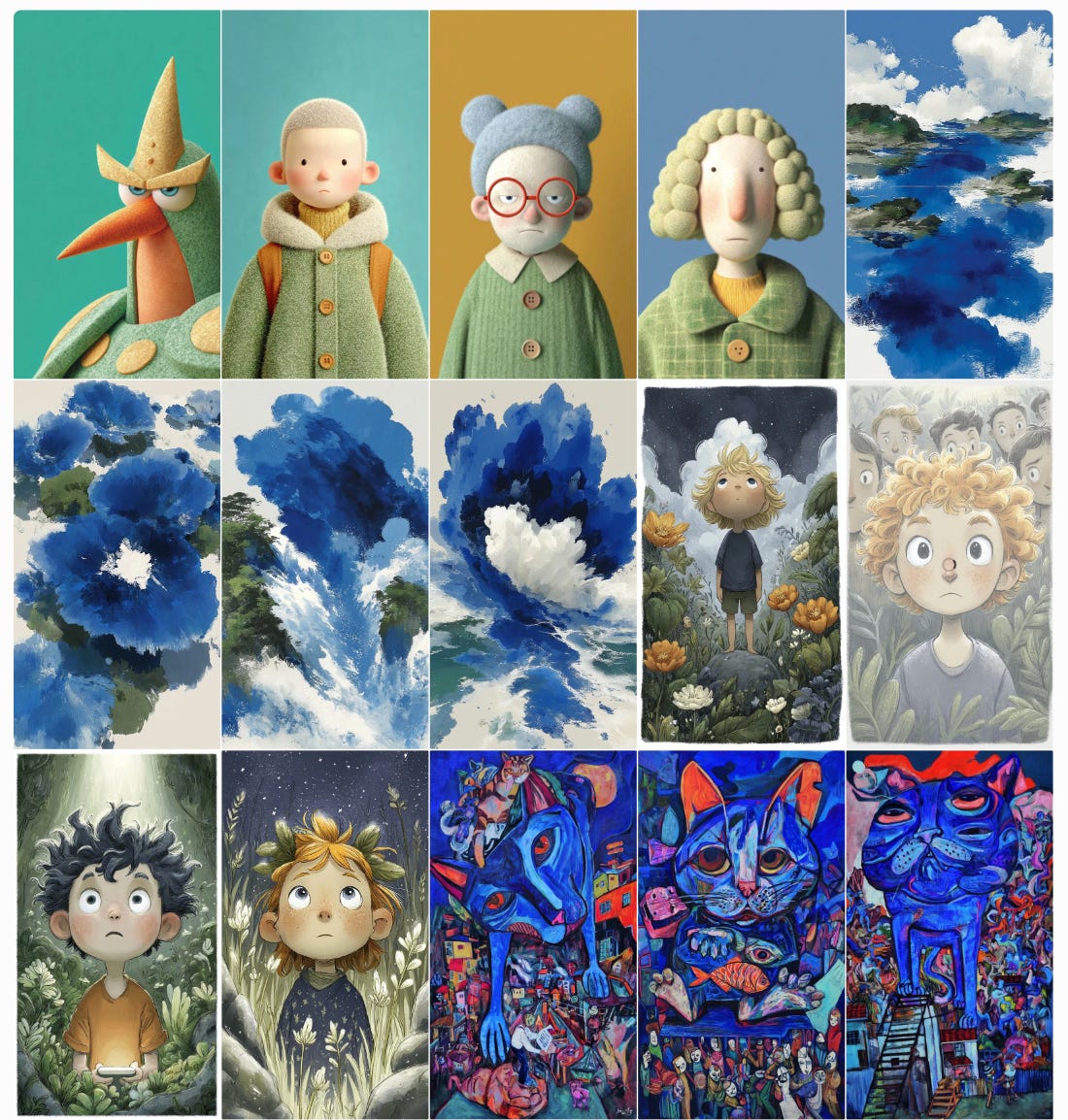 As you can see, the results are inspired by the images we added to our moodboard, but they aren’t blended into a single style. We get a variety of colors, shapes, and details — yet they all share the same overall mood.